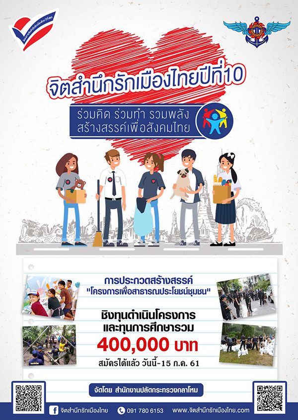 โดย “โครงการจิตสำนึกรักเมืองไทย ปีที่ 10” จะต้องนำเสนอโครงการที่ทำขึ้นเพื่อสาธารณประโยชน์มีเนื้อหาตามแนวคิดหลักของโครงการคือการร่วมกันสร้างจิตสำนึกในการพัฒนาท้องถิ่น หรือชุมชนอย่างสร้างสรรค์และทำได้จริงในระยะเวลาที่กำหนดคือ 30 วัน สมัครได้ตั้งแต่วันนี้ – 15 กรกฎาคม 2561 โดยจะประกาศผลโครงการที่ผ่านการคัดเลือกได้รับทุนดำเนินโครงการวันที่ 1 สิงหาคม 2561 ทาง Website และ Facebook Page จิตสำนึกรักเมืองไทย สามารถติดต่อสอบถามได้ที่Facebook : จิตสำนึกรักเมืองไทย