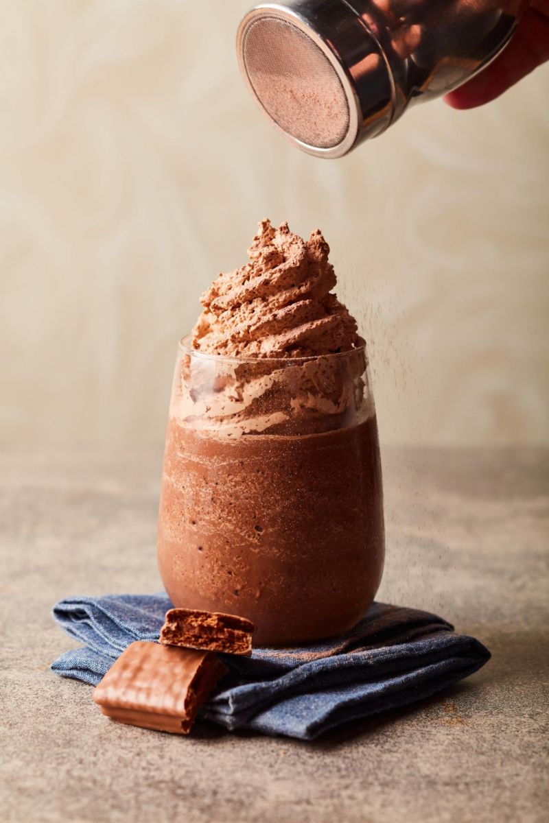 ชอบรสช็อคโกแลตเข้ม ๆ ผสมความรุบกรอบ ต้องลอง ช็อคโกแลต ทิม แทม (Chocolate Tim Tam) ปั่นทิมแทมกับซอสช็อคโกแลต ก่อนท็อปด้วย มูสช็อกโกแลต และทิมแทมอีกหนึ่งชิ้น