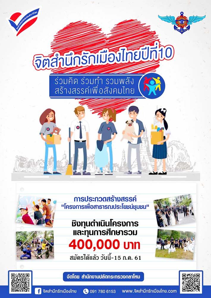 อีกหนึ่งกิจกรรมดีๆ ในโครงการ“จิตสำนึกรักเมืองไทยปีที่ 10” ที่จัดโดยสำนักงานปลัดกระทรวงกลาโหม เพื่อสร้างจิตสำนึกของเยาวชนให้ ร่วมคิด ร่วมทำ รวมพลังสร้างสรรค์เพื่อสังคมไทย ผ่านกิจกรรมประกวดโครงการเพื่อสาธารณประโยชน์ระดับเยาวชนในหัวข้อ “ร่วมคิด ร่วมทำ รวมพลังสร้างสรรค์เพื่อสังคมไทย”