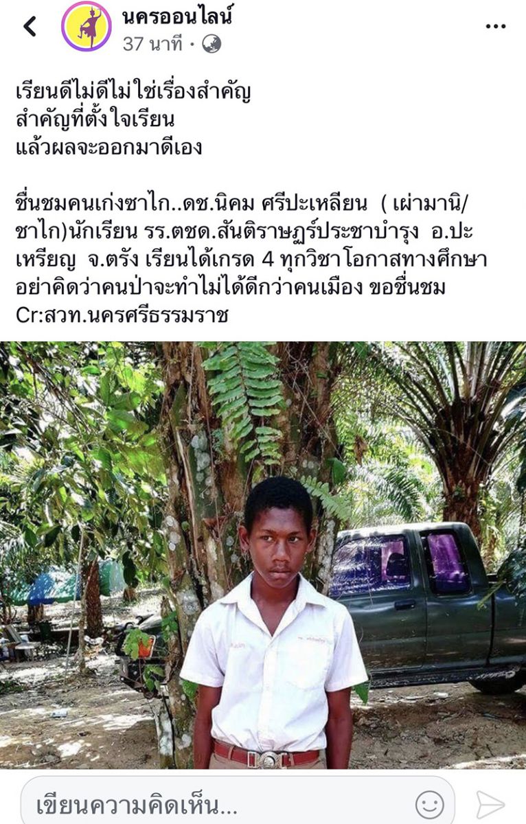 วันนี้ (10 มี.ค.) เพจ “นครออนไลน์” ได้โพสต์ภาพและข้อความชื่นชมคนเก่งซาไก ด.ช.นิคม ศรีปะเหลียน (เผ่ามานิ/ชาไก) ซึ่งเป็นเด็กนักเรียนโรงเรียน ตชด.สันติราษฏร์ประชาบำรุง อ.ปะเหลียน จ.ตรัง ที่เรียนได้เกรด 4 ทุกวิชา โอกาสทางศึกษาอย่าคิดว่าคนป่าจะทำไม่ได้ดีกว่าคนเมือง