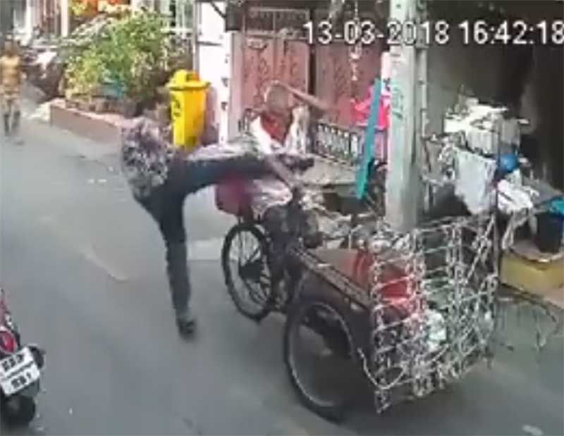 15 มี.ค. 61 เพจเฟซบุ๊ก “แหม่มโพธิ์ดำ” ได้โพสต์คลิปซึ่งเป็นภาพชายหนุ่มขี่รถจักรยานยนต์อยู่ภายในซอย มือซ้ายถือโทรศัพท์ มือขวาจับแฮนด์รถก่อนวิ่งสวนกับคุณตาที่ขี่รถซาเล้งผ่านมาแล้วเกี่ยวกันจนรถจักรยานยนต์ล้มลง ขณะที่คุณตาก็หยุดรถดูส่วนชายหนุ่มได้ลุกขึ้นเข็นรถหลบไปข้างทาง ก่อนวิ่งมาเตะที่หน้าอกคุณตาจนตกจากรถซาเล้งแถมเตะซ้ำจนหมดสติกองอยู่กับพื้นชาวบ้านพยายามห้ามปรามแต่ไม่เป็นผล หลังก่อเหตุไปหลบหนีไป