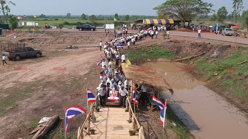 ผู้นำชุมชนร่วมกับชาวบ้านหนองหอย ทั้งหมู่บ้านกว่า 100 คน ต.นาหนัง อ.โพนพิสัย จังหวัดหนองคาย ร่วมใจกัน อัญเชิญพญานาคปู่แสงสุทโธ เดินตามสะพานไม้ไผ่ ขึ้นประทับศาล ที่ชาวบ้านร่วมแรงศรัทธา สร้างก่อนจะเปิดให้เป็นแหล่งท่องเที่ยวในต้นเดือนเมษายนนี้