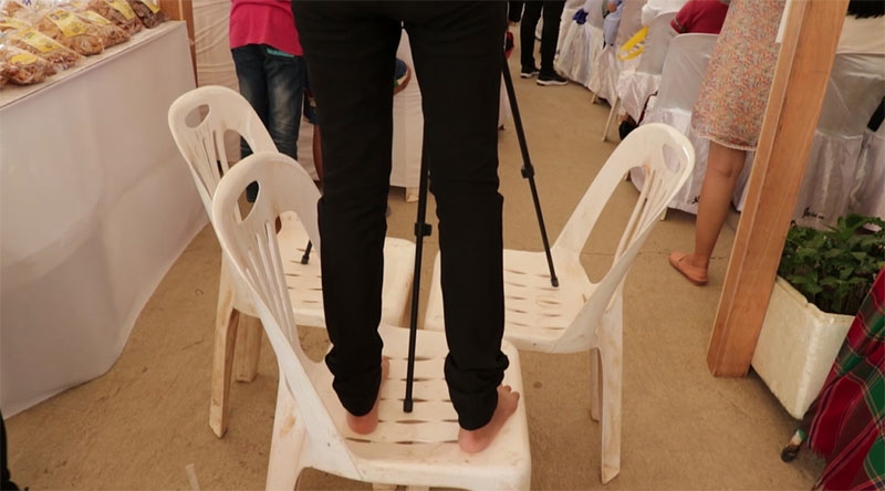 ช่างภาพสาวเลยปิ๊งไอเดีย โดยการนำขา 4 5 6 ของกล้อง ใช้ให้เป็นประโยชน์ ก็คือการนำเก้านั่งอีก 3 ตัวมารองเป็นขาต้องกล้องอีกครั้ง ให้สูงขึ้น เพราะทั้งขากล้อง คนนั้นก็สูงไม่พอ และนักข่าวสาวก็ต้องปีนขึ้นไปบนเก้าอีกด้วย และที่สำคัญขาเก้าอี้ไม่แข็งแรงคนทั้งงานเลยกลัวน้องนักข่าวสาวตก