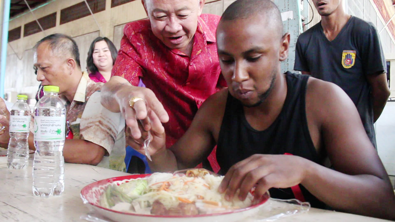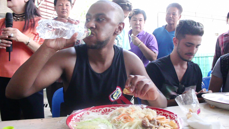 นักท่องเที่ยวชาวบราซิลขอท้าควรแข่งกินส้มตำถาด ศึกวันสะท้านคลองดำเนินสะดวกกับผู้ท้าชิงชาวไทย ในงานเทศกาลองุ่นหวานของดีดำเนินสะดวก ครั้งที่ 32