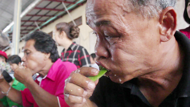 เมื่อกรรมการนับถอยหลังให้สัญญาณ 3 2 1 ผู้เข้าแข่งขันทีมชายทั้ง 15 คน ต่างฝ่ายต่างไม่มีใครยอมใคร ทั้งจ้วง ทั้งจก บางคนถึงขนาดคลุกรวมกันทั้งหมดแล้วใช้มือเปิบใส่ปากอยากรวดเร็ว ในขณะที่นายเฟโดร นั่งกินอย่างสบายใจ ใช้มือหยิบเส้นขนมจีนขึ้นมาวนบนฝ่ามือแล้วค่อยกิน ทำเอากองเชียร์ที่ทั้งลุ้น ทั้งส่งเสียงเชียร์กันสุดมัน ซึ่งเวลาผ่านไปประมาณ 7 นาที ผลปรากฏว่าผู้แข่งขันหมายเลข 6 ได้ลุกขึ้นยืนพร้อมทั้งชูถาดว่าตนเองรับประทานหมด เป็นลำดับแรงทำเอากองเชียร์และคณะกรรมการถึงกับต้องอึ้งเพราะสามารถทำเวลาในการรับประทานได้รวดเร็ว ไม่ถึง 10 นาทีสามารถรับประทานส้มตำถาดยักษ์หมดเป็นอับดับแรก