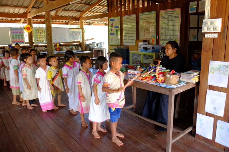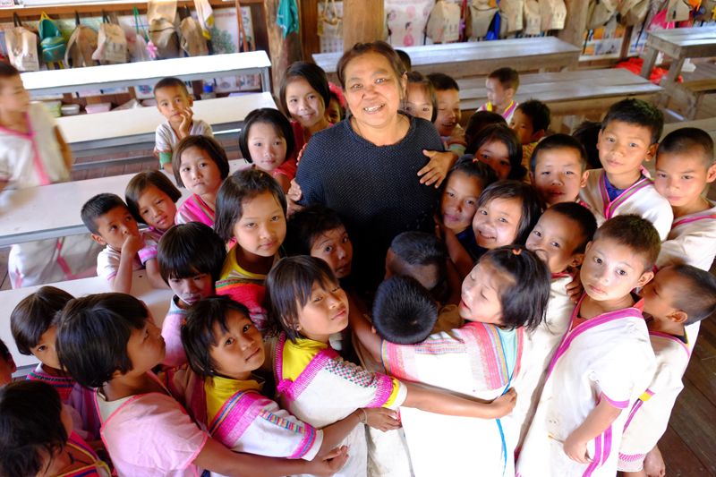 “เด็กๆ ที่นี่เราไม่เน้นเรื่องความเก่ง แต่เราเน้นเรื่องของการเป็นคนดี เพราะวันนี้ในการจัดการเรียนการสอนหรือหลักสูตรเรามักจะไม่ไม่เน้นคน ดี เน้นแต่คนเก่ง แม้ว่าความเก่งจะใช้ประโยชน์ได้จริง แต่ถ้าเก่งแล้วไม่ดีหรือเก่งแล้วโกงจะมีประโยชน์อะไร แต่สิ่งที่สำคัญคือเขาต้องรู้ตัวเองว่าเขาเป็นคนไทยไม่ใช่กะเหรี่ยง กระเหรี่ยงมันเป็นแค่เชื้อชาติเฉยๆ แต่ทุกคนเป็นคนไทย และความรู้ที่เขาได้รับถ้าเกิดเขาไม่เรียนต่อเขาก็จะอยู่ในสังคมได้โดยไม่ถูกใครมาหลอกลวง เพราะคนที่มีความรู้เขาจะไม่ถูกหลอก” ครูเจี๊ยบ กล่าวถึงหลักการสอน