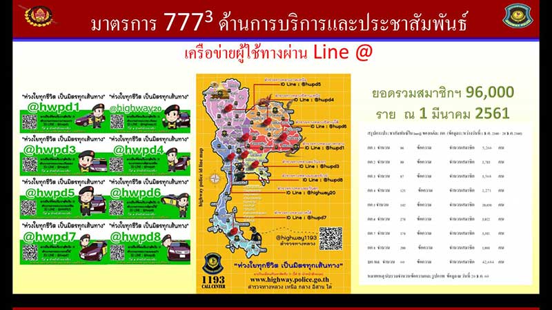 1. ด้านการให้บริการ เราได้กำหนด มาตรการ 777 ยกกำลัง 3 ใน 77 เส้นทางทั่วประเทศ ในส่วนนี้จะมีหน่วยบริการตำรวจทางหลวง จำนวน 200 แห่ง และในจำนวน 88 แห่ง มีบริการห้องนอนแอร์ ห้องน้ำ อาหาร ตรวจรถ ใบสั่ง/ปรับ GPS ไว้พักผ่อนสำหรับเหนื่อยล้า ง่วง จากการขับรถแต่มีจำกัดเพียง 5-6 เตียงต่อหน่วย บริการฟรีตลอด 24 ชั่วโมง แต่ละหน่วยสามารถดูได้จาก Google Maps และแอปพลิเคชั่นไลน์ ซึ่งมาตรการ 777 ยกกำลัง 3 จะเป็นการเพิ่มความเข้มข้นในทุกๆ เรื่อง