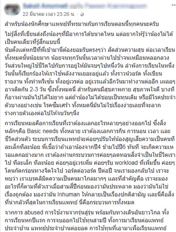 ขณะเดียวกัน ผู้ใช้เฟซบุ๊กรายหนึ่งที่ระบุว่าเป็นรุ่นพี่ของนักศึกษาแพทย์ที่เสียชีวิตนั้น ได้ออกมาโพสต์ข้อความระบุว่า การเรียนหมอ ต้องแลกกับอะไรหลาย ๆ อย่าง หลัก ๆ ก็คือความต้องการขั้นพื้นฐานเช่นการกิน นอน เวลา และชีวิตส่วนตัว ระบบการเรียนแพทย์ จะทำให้ค่อย ๆ สูญเสียความเป็นคนทีละน้อย หากคนที่สุขภาพร่างกายหรือจิตใจไม่แข็งแรง เช่น เป็นโรคซึมเศร้า ก็อาจจะผ่านช่วงเวลาเหล่านี้ไปได้อย่างยากลำบาก เพราะปรับตัวให้เข้ากับระบบไม่ได้ จนสภาพจิตใจเริ่มหดหู่ เครียด เศร้า ถึงขั้นรู้สึกไม่อยากมีชีวิตอยู่