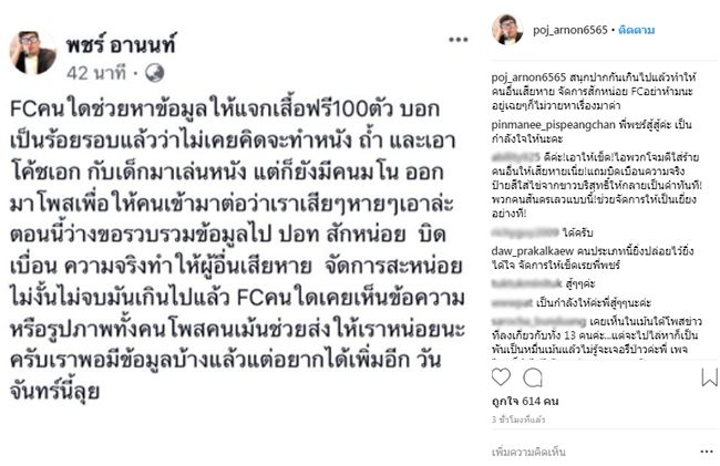 ล่าสุด “พชร์ อานนท์” ได้ออกมาโพสต์ภาพข้อความจะเอาผิดกับบุคคลที่ให้ข้อมูลบิดเบื่อนว่าจะสร้างหยังชีวิตเกี่ยวกับทีมหมูป่าติดถ้ำหลวงขุนน้ำนางนอน…”FCคนใดช่วยหาข้อมูลให้แจกเสื้อฟรี100ตัว บอกเป็นร้อยรอบแล้วว่าไม่เคยคิดจะทำหนัง ถ้ำ และเอาโค้ชเอกกับเด็กมาเล่นหนัง แต่ก็ยังมีคนมโนออกมาโพสเพื่อให้คนเข้ามาต่อว่าเราเสียๆ หายๆ เอาล่ะตอนนี้ว่างขอรวบรวมข้อมูลไป ปอท. สักหน่อย บิดเบื่อนความจริงทำให้ผู้อื่นเสียหาย จัดการซะหน่อย ไม่งั้นไม่จบมันเกินไปแล้ว FC คนใดเคยเห็นข้อความหรือรูปภาพทั้งคน โพสคนเม้นช่วยส่งให้เราหน่อยนะครับเราพอมีข้อมูลบ้างแล้ว แต่อยากได้เพิ่มอีก วันจันทร์นี้ลุย”