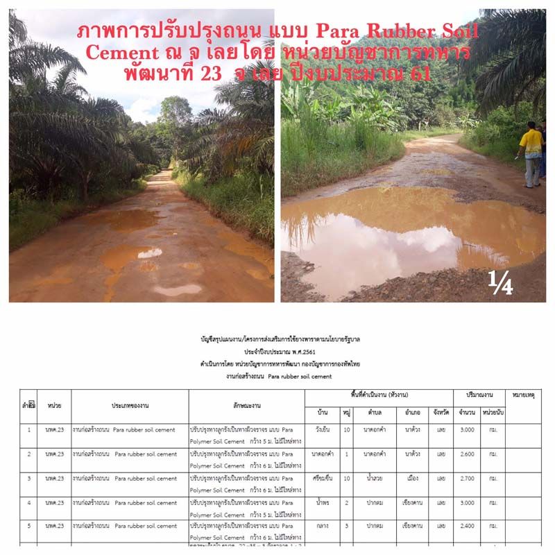28 พ.ย.61 นายกฤษฎา บุญราช รัฐมนตรีว่าการกระทรวงเกษตรและสหกรณ์ เปิดเผยว่า สั่งการให้เกษตรจังหวัดทุกจังหวัด ร่วมกับพื้นที่สำรวจตรวจสอบการใช้ยางพารา ตามแนวทางสนับสนุนการใช้ยางภาครัฐนั้น ขณะนี้มีหลายจังหวัดเริ่มดำเนินการทำถนนยางพารา อาทิ เกษตรจังหวัดเลย ได้ตรวจสอบและรายงานให้ทราบว่า หน่วยบัญชาการทหารพัฒนา นพค.23 ได้ดำเนินโครงการปรับปรุงทางลูกรังเป็นทาง para rubber polymer soil cement ในพื้นที่ จ.เลย จำนวน 7 เส้นทาง งบประมาณปี 2561/กันเหลื่อมปี 62 ในสูตร ปรับปรุงทางผิวจราจรลูกรัง para rubber polymer cement ถนนลงลูกรังหนา 10 ซม.จะใช้น้ำยาง Pre-blended 2.10 กก./ตร.ม.และปูนซีเมนต์ปอร์ตแลนด์ (ประเภทงานโครงสร้าง) 14.20 กก./ตร.ม.