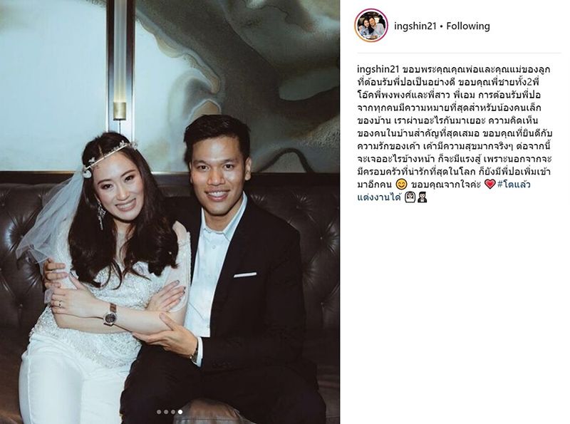 “ขอบพระคุณคุณพ่อและคุณแม่ของลูกที่ต้อนรับพี่ปอเป็นอย่างดี ขอบคุณพี่ชายทั้ง 2 พี่โอ๊ค พี่พงพงศ์ และพี่สาว พี่เอม การต้อนรับพี่ปอจากทุกคนมีความหมายที่สุดสำหรับน้องคนเล็กของบ้าน เราผ่านอะไรกันมาเยอะ ความคิดเห็นของคนในบ้านสำคัญที่สุดเสมอ ขอบคุณที่ยินดีกับความรักของเค้า เค้ามีความสุขมากจริง ๆ ต่อจากนี้จะเจออะไรข้างหน้าก็จะมีแรงสู้ เพราะนอกจากจะมีครอบครัวที่น่ารักที่สุดในโลก ก็ยังมีพี่ปอเพิ่มเข้ามาอีกคน ขอบคุณจากใจค่ะ #โตแล้วแต่งงานได้”