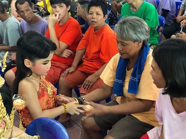 โดยมีลุงพัน ภานุพันธ์ ครุฑโต พิธีกรรายการ “ไมค์ทองคำเด็ก” , ดีเจท็อป ศราวุธ พลอยประดับ พิธีกรรายการ “ลูกทุ่งท็อปไฟว์” ของช่องเวิร์คพอยท์ นอกจากนี้ยังมีพี่ๆ น้องๆจากบ้านนาฎศิลป์ไทย พระราม 2 จัดการแสดงไปสร้างความสุขให้กับผู้ป่วยทุพพลภาพถึงจำนวน 6 ชุดการแสดง ตบท้ายด้วยการร้องเพลงเพราะๆของน้องฟ้าใส ซึ่งทุกการแสดงสร้างความสุขให้กับผู้ป่วยทุกคน ต่างลุกขึ้นมาเต้นตามกันอย่างสนุกสนาน โดยตลอดกิจกรรมถือเป็นการฟื้นฟูและพัฒนาร่างกายและจิตใจให้แก่คนพิการ ชาย-หญิง ที่ยากจนและด้อยโอกาส ขาดผู้อุปการะเลี้ยงดู หรือถูกทอดทิ้ง ให้สามารถดำรงชีวิตได้อย่างมีความสุข กระทั่งสามารถกลับคืนสู่สังคมและพึ่งตนเองได้ต่อไป พร้อมกันนี้ยังนำสิ่งของที่ทางศูนย์ฯยังขาดอยู่ อาทิ ผ้าอ้อมผู้ใหญ่, ผงซักฟอก, น้ำยาทำความสะอาด ฯลฯ ไปร่วมบริจาคด้วย เมื่อการแสดงจบทุกคนก็พากันไปเสิร์ฟอาหารให้ผู้ป่วยทุกคนได้อิ่มหมีพีมัน เรียกได้ว่ามีความสุข สร้างรอยยิ้มให้ทั้งผู้ให้และผู้รับอย่างแท้จริง