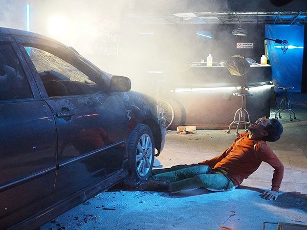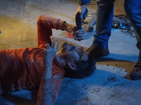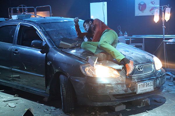 เรียบร้อยในคัทแรก ก็มาเจาะถ่ายในคัทที่สอง ผู้กำกับฯ ส่งสัญญาณให้เต๋าก็เร่งเครื่องขับออกมา จนโมทย์ซึ่งอยู่บนหลังคาตกลงมา และถูกล้อทับขาไปไหนไม่รอดหลังจากถ่ายเจาะมุมต่างๆก็ถึงซีนที่เต๋า-โมทย์ต้องใส่อารมณ์ต่อกันระหว่างคนที่มีอารมณ์เคียดแค้น กับอีกคนที่นอกจากจะจิตป่วย งานนี้ทั้งเต๋าและโมทย์ ต้องตอบโต้กันด้วยบทพูดยาวกว่าซีนอื่น แม้จะมือโปรกันทั้งคู่ แต่ก็ยังมีเทคกันถึงสองครั้ง เสร็จจากถ่ายทำในฉากนี้ทั้งคู่เผยให้ฟังสั้นๆ ว่า “วันนี้ถือว่าหนักอีกวันครับ มีการปะทะคารมกันด้วย ซึ่งบทยาวมาก เราก็พยายามทำให้เต็มที่ ทำให้นึกถึงบรรยากาศเก่าๆ ที่ได้ร่วมงานกัน บทสรุปจะเป็นอย่างไร ฝากติดตามชมกันด้วยนะครับ” ด้านพี่เต๋าเผยต่อว่า“ฉากนี้ยิงกันมันส์เลย แถมยังต้องใส่อารมณ์ดราม่าด้วย ซึ่งโมทย์ก็ส่งอารมณ์มาให้ดี เลยรับ-ส่งกันได้ครับ เต็มที่ดับดับเครื่องชนไปเลยครับ”