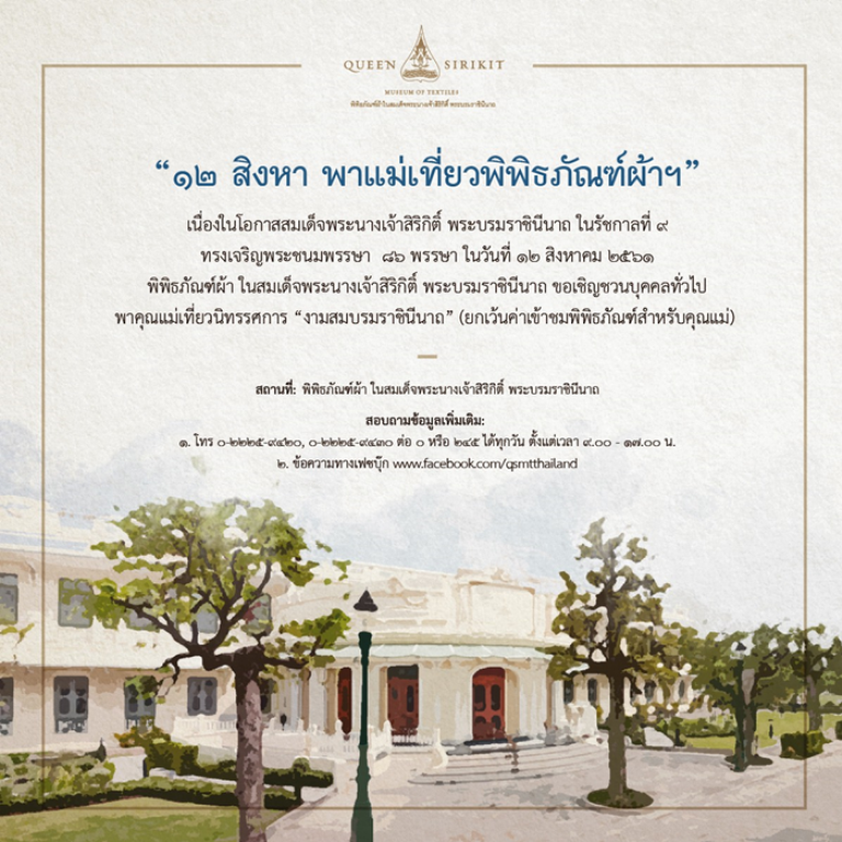 แต่ถ้าอยากซึมซับกับความเป็นไทย แนะไปให้จูงมือกันไปชมนิทรรศการ “งามสมบรมราชินีนาถ” ที่พิพิธภัณฑ์ผ้า ใน สมเด็จพระนางเจ้าสิริกิติ์ พระบรมราชินีนาถ ซึ่งปีนี้ พิเศษสุดๆ เพราะเปิดให้ คุณแม่เข้าชมได้ฟรีตั้งแต่เวลา 09.00-17.00 น. สอบถามข้อมูลเพิ่มเติมโทร 02-225-9420,02-225-9430 ต่อ 0 หรือ 245 หรือ http://www.facebook.com/qsmtthailand