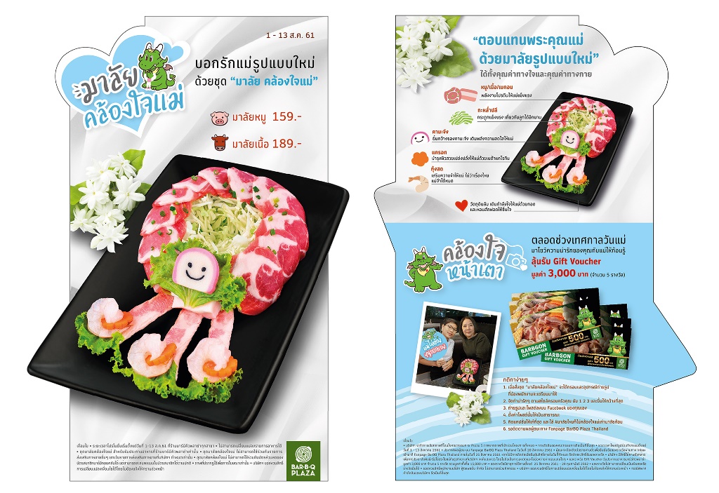 เอาใจคุณแม่สายชอบกิน ไม่ต้องหนักใจหากคุณกำลังมองหาร้านเด็ดโปรโมชั่นโดน เพื่อพิชิตใจคุณแม่สายกินที่ตระเวนชิมร้านเด็ดร้านดังมานับไม่ถ้วน จนเกรงว่าพาไปร้านไหนก็ไม่เซอร์ไพรส์ เพราะวันแม่ปีนี้ มีหลายร้านขนโปรเด่นน่าโดนมาให้เลือกเพียบ แต่ที่แจ่มว้าวน่าไปลองเพราะเข้ากับเทศกาลวันแม่สุดๆ ต้องหลีกทางให้ชุดมาลัยคล้องใจแม่ จากบาร์บีคิวพลาซ่า ที่นอกจากจะรังสรรค์พวงมาลัย (กินได้) สุดเก๋ที่รับรองว่าไม่มีใครซ้ำมาให้คุณลูกได้เซอร์ไพรส์ และมอบเป็นของขวัญสื่อรักแทนใจแล้ว คุณลูกยังได้ใช้ช่วงเวลาในมื้ออาหารแสนพิเศษนี้ทำให้คุณแม่ปลื้มจนลืมไม่ลง ด้วยการช่วยปิ้งและคีบอาหารให้คุณแม่ได้อิ่มท้องและอิ่มอกอิ่มใจไปพร้อมๆกัน