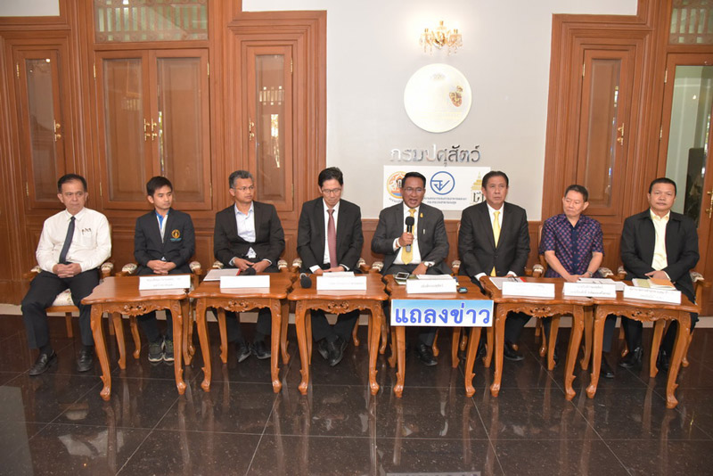 26 ธ.ค.61 เวลา 11.00 น. นายสัตวแพทย์สรวิศ ธานีโต อธิบดีกรมปศุสัตว์ นายแพทย์ธเรศ กรัษนัยรวิวงค์ เลขาธิการสำนักงานคณะกรรมการอาหารและยา นายวรพัฒน์ เชาว์วิศิษฐ ผู้อำนวยการสำนักงานศุลกากรตรวจของผู้โดยสารท่าอากาศยานสุวรรณภูมิ กรมศุลกากร และผู้แทนจากภาคมหาวิทยาลัย (จุฬาลงกรณ์มหาวิทยาลัยและมหาวิทยาลัยมหิดล) ร่วมแถลงข่าวบูรณาการหน่วยงานร่วมต้านโรคอหิวาต์แอฟริกาในสุกร (ASF) เข้าประเทศไทย พร้อมด้วยนายสัตวแพทย์จีระศักดิ์ พิพัฒนพงศ์โสภณ รองอธิบดีกรมปศุสัตว์ นายสัตวแพทย์สมชวน รัตนมังคลานนท์ รองอธิบดีกรมปศุสัตว์ และผู้ที่เกี่ยวข้องของกรมปศุสัตว์ ได้แก่ ผู้อำนวยการสถาบันสุขภาพสัตว์แห่งชาติ ผู้อำนวยการสำนักควบคุม ป้องกันและบำบัดโรคสัตว์ ผู้อำนวยการกองสารวัตรและกักกัน และผู้อำนวยการกองควบคุมอาหารและยาสัตว์