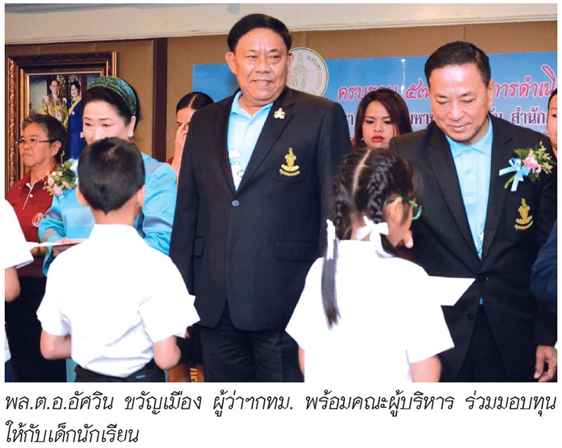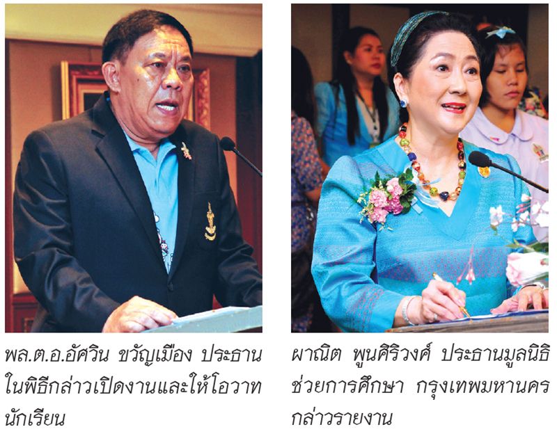 พล.ต.อ.อัศวิน ขวัญเมือง ผู้ว่าราชการกรุงเทพมหานคร เป็นประธานในพิธี ได้กล่าวเปิดงานและให้โอวาทแก่นักเรียนที่ได้รับทุนว่า สมเด็จพระนางเจ้าฯ พระบรมราชินีนาถ ในรัชกาล 9 ทรงให้ความสนพระราชหฤทัยต่อการศึกษาเยาวชนของชาติเป็นอย่างยิ่ง การที่มูลนิธิช่วยการศึกษา กรุงเทพมหานคร ได้จัดให้มีการมอบทุนสนับสนุนการศึกษาแก่เด็กนักเรียนของโรงเรียนในสังกัดกรุงเทพมหานครมาอย่างต่อเนื่อง เป็นปีที่ 57 เพื่อถวายเป็นพระราชกุศล นับเป็นการสนองพระราชปณิธานของสมเด็จพระนางเจ้าฯ พระบรมราชินีนาถในรัชกาลที่ 9 และยังเป็นกำลังใจให้กับนักเรียนในการที่จะตั้งใจศึกษาเล่าเรียนต่อไป