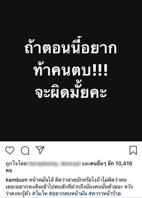 “ถ้าตอนนี้อยากท้าตบคน จะผิดไหมคะ” พร้อมกับข้อความบรรยายใต้ภาพด้วยว่า “น่าหมั่นไส้ คิดว่าสวยนักหรือไงถ้าไม่ติดว่าคนเยอะอยากจะเดินเข้าไปตบสักที ฝากถึงน้องคนนั้นด้วยนะ หวังว่าคงจะรู้ตัว โมโห อยากตบหน้ามัน ดาราหน้าร้าย”