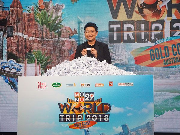 คุณนันทพันธ์แสงไชยผู้ช่วยผู้อำนวยการสถานีโทรทัศน์ช่อง MONO29 (โมโนทเวนตี้ไนน์) ในเครือโมโนกรุ๊ปให้เกียรติจับรางวัลพร้อมประกาศผลผู้โชคดีที่จะร่วมเดินทางบินลัดฟ้าไปไกลถึงเมือง “โกลด์โคสต์”ประเทศออสเตรเลียจำนวน 4 รางวัลรางวัลละ 2 ท่านโดยทริปนี้ได้ 2 พิธีกรอารมณ์ดี “คริสโตเฟอร์ไรท์” จากรายการ Movie Language และ “ทิชา -พชรวรรณวาดรักชิต” จากรายการ Entertainment Now อาสาพาไปตะลุยโกลด์โคสต์เมืองตากอากาศริมทะเลสุดฮิตพร้อมบุกโลกบันเทิงกับสวนสนุก “วอร์เนอร์บราเธอร์สมูฟวี่เวิลด์” ทั้งนี้จะเดินทางในวันที่ 14 – 19 ตุลาคม 2561