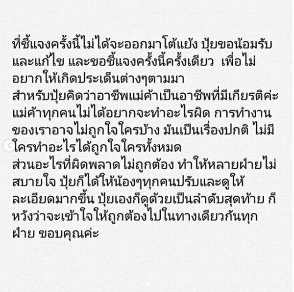 ที่ชี้แจงครั้งนี้ไม่ได้จะออกมาโต้แย้ง ปุ้ยขอน้อมรับและแก้ไข และขอชี้แจงครั้งนี้ครั้งเดียว เพื่อไม่อยากให้เกิดประเด็นต่างๆ ตามมา