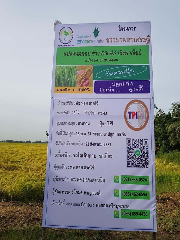 ข้าวพันธุ์ กข.43 ในปัจจุบันกำลังเป็นที่จับตามอง เนื่องจากเป็นข้าวขาวทานง่าย ค่าดัชนีน้ำตาลต่ำ เหมาะกับผู้บริโภคที่ป่วยเป็นโรคเบาหวาน หรือผู้ที่ห่วงใยสุขภาพ รวมถึงผู้ที่กำลังลดน้ำหนัก ที่ต้องการจะลดปริมาณน้ำตาลจากข้าว และอาหารที่กินในแต่ละวัน แต่จะดีแค่ไหนหากสามารถปลูกด้วยปุ๋ยออร์แกนิกทั้งระบบโครงการชาวนามหาเศรษฐี โดย บริษัท ทีพีไอ โพลีน ชีวะอินทรีย์ จำกัด ได้ทำแปลงตัวอย่างร่วมกับ พ่อหอม ฮวดใช้ เจ้าของแปลงนาข้าว ปลูกข้าวในพื้นที่ 10 ไร่ ที่ ต.คลองสวน อ.บางบ่อ จ.สมุทรปราการ ได้เก็บเกี่ยวผลผลิตไปเมื่อวันที่ 22 สิงหาคม 2561 อายุข้าว 95 วัน โดยได้ข้าวถึง 930 กก.ต่อไร่ จากการใช้ปุ๋ยออแกนิค ทีพีไอ เท่านั้น