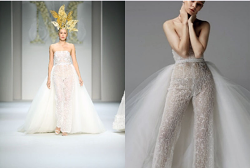 ทว้าจ้าสาวเป็นสายมั่น ก็มีชุดที่เอาใจสาวเท่ ถ้าไม่อยากให้ลุคออกมาหวานเกินไปแนะนำชุดแต่งงานแบบกางเกง หรือจัมพ์สูท ที่กำลังมาแรง ช่วงบนเป็นเกาะอก เติมดีเทลอย่างเช่น โบว์หรือผ้าลูกไม้ลายสวยเก๋ๆ เพื่อไม่ดูเรียบเกินไปอาจเพิ่มความเซ็กซี่ซีทรูผสมผสานไปกับชุดสไตล์นี้ ช่วยให้ลุคเป็นสาวมั่น และเท่สุดๆ