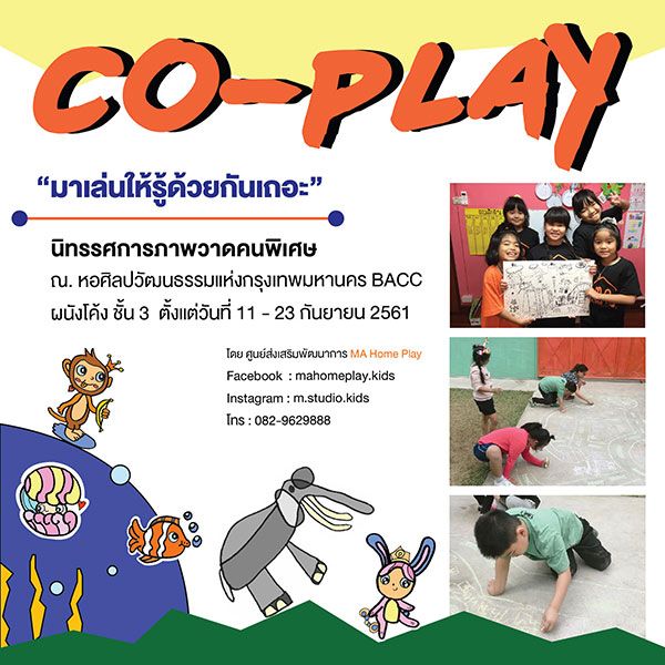 ศูนย์ส่งเสริมพัฒนาการ MA Home Play จัดงานนิทรรศการศิลปะเพื่อคนพิเศษครั้งที่ 2 โดยมีวัตถุประสงค์เพื่อโชว์ผลงานศิลปะของเด็กที่มีความต้องการพิเศษ เช่น ผลงานของเด็กออทิสติก , เด็กสมาธิสั้น , เด็กที่มีความบกพร่องทางการได้ยิน , เด็กดาวน์ซินโดรม โดยนิทรรศการในครั้งนี้จะถูกถ่ายทอดผ่าน Concept “Co-Play” มาเล่นให้รู้ด้วยกันเถอะ เด็กๆจะได้แสดงออกถึงศักยภาพทางศิลปะในรูปแบบที่หลากหลายผ่านการเรียนรู้ร่วมกันเป็นกลุ่ม ซึ่งเป็นประโยชน์มากสำหรับเด็กกลุ่มนี้ เพราะเด็กๆจะรู้จักรอคอย แบ่งปัน รู้จักเชื่อมโยงความคิดของตนเองกับเพื่อนๆ ทำให้มีความคิดริเริ่ม และความคิดสร้างสรรค์ โดยผลงานดังกล่าว จัดแสดงในระหว่างวันที่ 11-23 กันยายน 2561ณ บริเวณ ผนังโค้ง ชั้น3 หอศิลปวัฒนธรรมแห่งกรุงเทพมหานคร (BACC)รายได้หลังหักค่าใช้จ่ายทั้งหมดถูกนำไปเป็นค่าใช้จ่ายในการจัดกิจกรรมต่างๆ ต่อไป