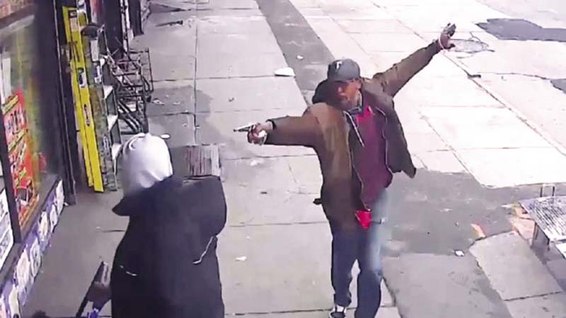 ไม่ใช่ปืน : ภาพจากกล้องวงจรปิด เผยให้เห็นภาพนายชาฮีด วาสเซล ชายผิวสีสภาพจิตไม่ปกติ เล็งท่อนเหล็กที่ดูเหมือนอาวุธปืนเข้าใส่ผู้คนบนทางเท้าในย่านบรูคลิน ของนครนิวยอร์ก จนมีผู้แจ้งตำรวจ ก่อนที่ในเวลาต่อมา ตำรวจ 4 นาย จะมารุมล้อมนายวาสเซล และยิงเข้าใส่ 10 นัดจนเสียชีวิต ทั้งที่เขามีเพียงท่อนเหล็กในมือ