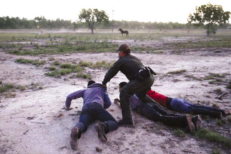 จับได้แล้ว : เซอร์จิโอ รามิเรซ เจ้าหน้าที่ลาดตระเวนพรมแดนสหรัฐ ตะครุบตัวผู้ลักลอบเข้าเมืองผิดกฎหมาย 2 คน ที่พยายามเดินเท้าข้ามพรมแดนจากเม็กซิโกมายังสหรัฐ บริเวณเทือกเขาริโอ กรันเด ใกล้เมืองแมคอัลเลน รัฐเท็กซัส