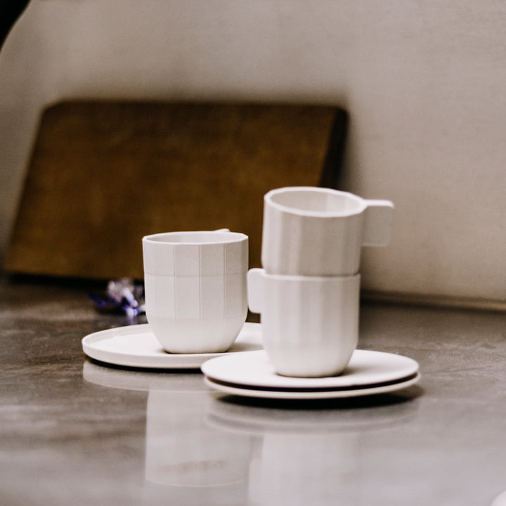 The Paper Porcelain drinkware collection is crafted in ceramic but looks like coarse recycled paper. The series includes an espresso cup with saucer, a coffee cup with saucer, a mug and a tea plate.
