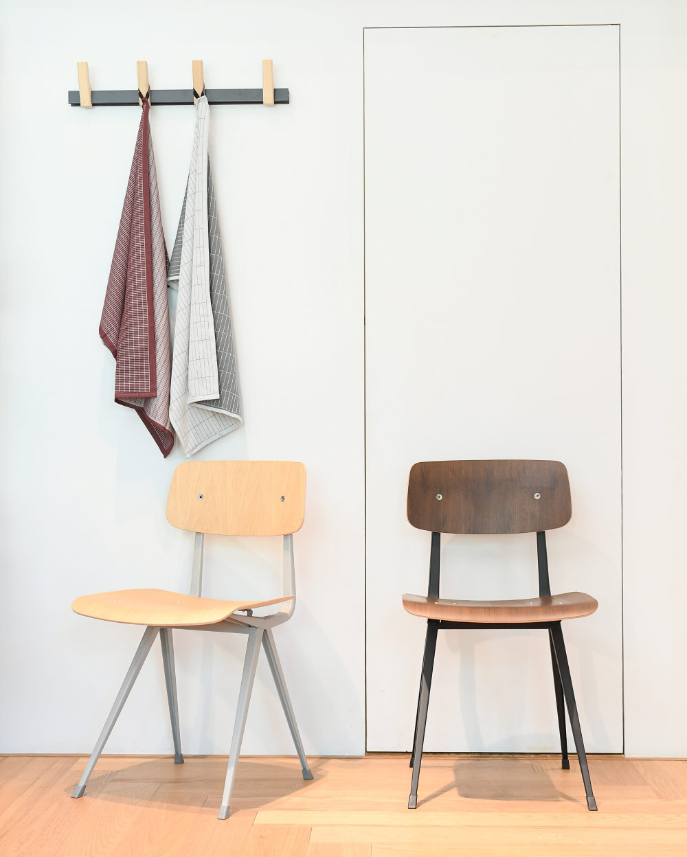 Originally created in 1950s for a university in Amsterdam, the Result chair features a thin steel-sheet base with an oak seat and backrest, giving it maximum flexibility, lightness and strength.