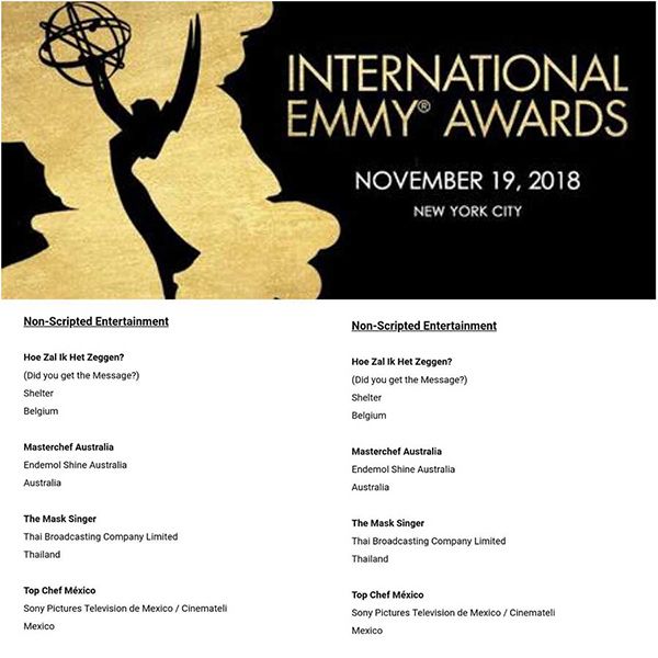 อีกหนึ่งความภาคภูมิใจของรายการโทรทัศน์ไทย สำหรับ รายการ The Mask Singer หน้ากากนักร้อง ที่ถือว่าเป็นรายการเดียวจากเอเชียที่ได้มีโอกาสเข้าชิงรางวัลINTERNATIONAL EMMY AWARDS 2018ประเภท “Non-Script Entertainment”และ เป็น 1 ใน 4 รายการที่เข้ารอบสุดท้ายในการชิงรางวัล จาก 4 ประเทศ ได้แก่ รายการดิส ยู เกท เดกอร์ เมส เสจ จากประเทศเบลเยี่ยม, รายการมาสเตอร์เชฟ จากประเทศออสเตรเลีย, รายการท๊อป เชฟ จากประเทศเม็กซิโก และรายการ The Mask Singer