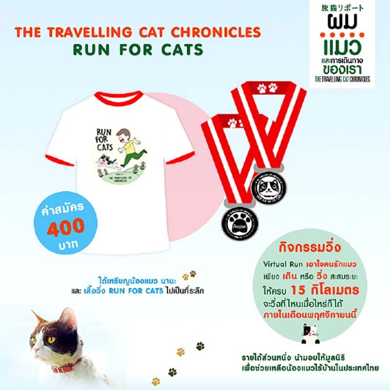 มงคลซีเนม่า และ ภาพยนตร์ THE TRAVELLING CAT CHRONICLES ชวนคนรักแมว วิ่งช่วยแมวจรจัดใน กิจกรรม RUN FOR CATS วิ่งเสมือน VR RUN จะเดินหรือวิ่งที่ไหนเมื่อไหร่ก็ได้ สะสมระยะให้ครบ 15 กม. (ไม่จำเป็นต้องวิ่งจบในครั้งเดียว) ภายในวันที่ 30 พฤศจิกายน 2561 โดยส่งผลการวิ่งที่ได้ไปที่ email :nanarunforcats@gmail.com โดยผลการวิ่งสามารถส่งเป็นภาพถ่ายจากแอพพลิเคชั่น ภาพถ่ายระยะจากนาฬิกา หรือภาพถ่ายงานวิ่งที่เกิดขึ้นในเดือนพฤศจิกายน โดยส่งผลรวมการวิ่งเข้ามาภายในวันที่ 1-10 ธันวาคม 2561 เพื่อรับเสื้อและเหรียญที่ระลึก ก่อนออกเดินทางไปกับคนและแมว ในภาพยนตร์ THE TRAVELLING CAT CHRONICLES ผม.แมว. และการเดินทางของเรา ในโรงภาพยนตร์ 29 พฤศจิกายนนี้