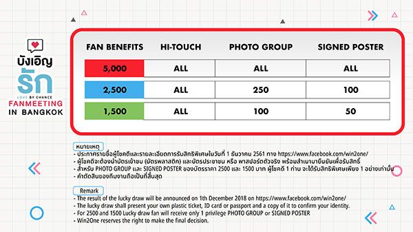 เปิดจำหน่ายบัตรอย่างเป็นทางการวันอาทิตย์ที่ 4 พฤศจิกายน2561เวลา 10.00 น.เป็นต้นไป ทาง http://www.win2oneth.com/บัตรราคา 5,000 / 2,500 และ 1,500บาทสามารถติดตามรายละเอียดเพิ่มเติมได้ที่FacebookFanpage : https://www.facebook.com/win2one/ #Lovebychanceseries
