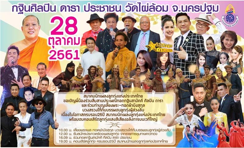 และในโอกาสนี้ได้รับเกียรติจาก 4 ศิลปินแห่งชาติ คุณไพรัช สังวริบุตร, คุณชาย เมืองสิงห์, คุณผ่องศรี วรนุช, คุณขวัญจิต ศรีประจันต์ และศิลปินดารา อาทิ ทับทิม อัญรินทร์, ลำไย ไหทองคำ, โอบะ เสียงเหน่อ, สดใส รุ่งโพธิ์ทอง, ศรเพชร ศรสุพรรณ, สัญญา พรนารายณ์ , รุ่งเพชร แหลมสิงห์, ศิรินทรา นิยากร, ทศพล หิมพานต์, สลักจิต ดวงจันทร์, เกษม คมสันต์ , อัมพร แหวนเพชร, แมงปอ ชลธิชา , สุดา ศรีลำดวน, นุจรี ศรีราชา, ตุ้ม พิชิตชัย, ยิปซี ศรีสาคร ฯลฯ พร้อมด้วยดารานักแสดงนำจากละครดังเรื่อง “สังข์ทอง” และ” ชะชะช่าท้ารัก” ทางช่อง 7 สี ร่วมทำบุญสืบสานประเพณีทอดกฐินสามัคคี และทำพิธีบวงสรวงใหญ่ให้กับบรรพชนลูกทุ่งผู้ล่วงลับ เนื่องในโอกาสครบรอบ 25 ปี สมาคมนักเพลงลูกทุ่งแห่งประเทศไทย พร้อมชมคอนเสิร์ตลูกทุ่งแสงสีเสียงอลังการบนเวทีใหญ่ในช่วงค่ำ ณ วัดไผ่ล้อม จ.นครปฐม