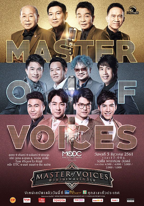องค์กรพันธมิตรทางด้านดนตรีอย่างบริษัทแมกโนเลีย ควอลิตี้ ดีเวล็อปเม้นต์ คอร์ปอเรชั่น จำกัด (MQDC) และ แพนเทอร์ เอ็นเทอร์เทนเมนท์ จับมือร่วมกันจัดคอนเสิร์ตเอาใจแฟนเพลงทั้ง 3 รุ่นที่ชื่นชอบเพลงลูกกรุงสุดอมตะมาร่วมทวนเข็มนาฬิกาย้อนสู่ห้วงเวลากันใน คอนเสิร์ต “MQDC presents Master of Voices ตำนานเพลงรัก 3 รุ่น” คอนเสิร์ตที่จะมอบความสุขความทรงจำ ให้แก่ผู้ฟัง 3 รุ่น 3 วัย ได้มีความประทับใจที่ดีร่วมกัน พบโชว์ใหม่ ที่เกิดจากแรงบันดาลใจของศิลปินรุ่นใหม่ร่วมแสดงความกตัญญูต่อศิลปินแห่งชาติ ร่วมสืบสานบทเพลงอมตะในอดีต ถ่ายทอดโดยศิลปิน 3 เจนเนอร์เรชั่น อาทิ รุ่นอมตะ ได้แก่ สุเทพ วงศ์กำแหง, ชรินทร์ นันทนาคร, ธานินทร์ อินทรเทพ, เศรษฐา ศิระฉายา , รุ่นฮิต ได้แก่ สุเมธ องอาจ, เท่ห์ อุเทน พรหมมินทร์, อ๊อด คีรีบูน, ฟอร์ด สบชัย ไกรยูรเสน และ รุ่นใหม่ ได้แก่ หนึ่ง อีทีซี , นนท์ ธนนท์, ต้น ธนษิต และ โอ ศิร์ภูมิ ซึ่งจะเปิดการแสดง ในวันพุธที่ 5 ธันวาคม 2561 ณ รอยัล พารากอน ฮอลล์ ชั้น 5 ศูนย์การค้า สยามพารากอน ตั้งแต่เวลา 17.00 น.(ประตูเปิด 16.00 น.)