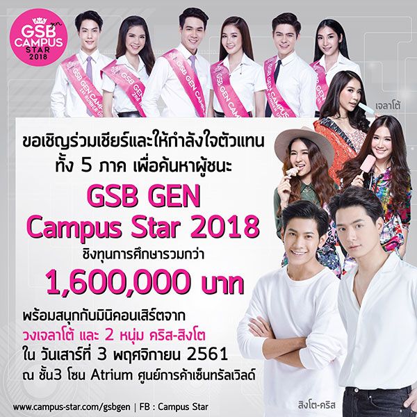 สวยหล่อมากความสามารถตามสูตรเป๊ะ! สำหรับผู้เข้ารอบการประกวด “GSB GEN CAMPUS STAR 2018” จากทั่วทุกภูมิภาค ที่งานนี้ ธนาคารออมสิน และ นิตยสาร CAMPUS STAR (แคมปัส สตาร์) ในเครือ โมโน กรุ๊ป ผู้จัดงาน ชวนลุ้นกันต่อในการประกาศผลในรอบตัดสิน พร้อมนำรุ่นพี่ในวงการบันเทิง นำทีมโดย คู่จิ้นสุดฮอต คริส-พีรวัส, สิงโต-ปราชญา และ ศิลปิน เบนซ์-ถุงแป้ง-นีน่า เจลาโต้ มาร่วมมอบความบันเทิง พบกัน วันเสาร์ที่ 3 พฤศจิกายน 2561 เวลา 14.00-18.00 น. ณ โซน เอเทรียม ชั้น 3 ศูนย์การค้าเซ็นทรัลเวิลด์ มาเจอกันให้ได้นะจ๊ะ