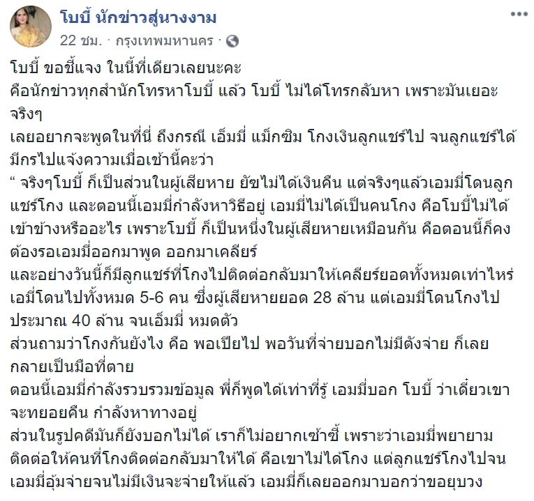 “โบบี้ ขอชี้แจง ในนี้ที่เดียวเลยนะคะ คือนักข่าวทุกสำนักโทรหาโบบี้ แล้ว โบบี้ ไม่ได้โทรกลับหา เพราะมันเยอะจริงๆ เลยอยากจะพูดในที่นี่ ถึงกรณี เอมมี่ แม็กซิม โกงเงินลูกแชร์ไป จนลูกแชร์ได้มีการไปแจ้งความเมื่อเช้านี้ค่ะว่า