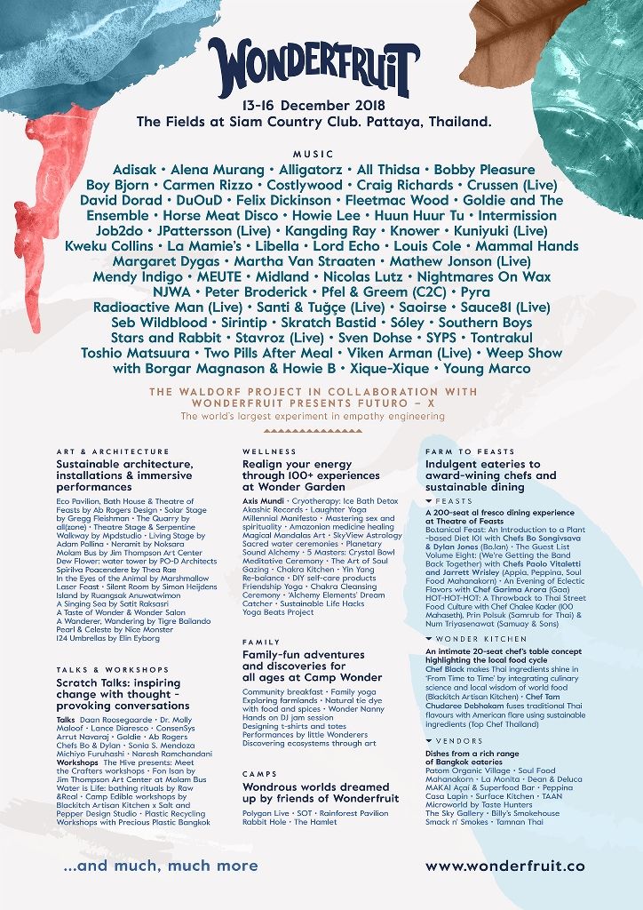 Wonderfruit 2018 วันเดอร์ฟรุ๊ต เฟสติวัลใส่ใจโลกโดยคนไทย นับถอยหลังสู่ปีที่ 5 วันแห่งการเฉลิมฉลองผ่านศิลปะ ดนตรี และไอเดียสร้างสรรค์ ที่ผสานแนวคิดด้านความยั่งยืนและสีสันของวัฒนธรรมอันหลากหลาย เหล่าวันเดอเรอร์จะได้เต็มอิ่มกับประสบการณ์ครอบคลุม 6 แขนง ได้แก่ ศิลปะและสถาปัตยกรรม ดนตรี ฟาร์มทูฟีสต์ ทอล์คและเวิร์คช็อป กิจกรรมเพื่อสุขภาพ และกิจกรรมสร้างสรรค์เพื่อครอบครัว อีกทั้งโปรแกรมความบันเทิงอีกคับคั่ง ที่จะเกิดขึ้นระหว่าง วันที่ 13-16 ธันวาคม 2561 ณ เดอะฟิลด์ แอท สยามคันทรีคลับ พัทยา