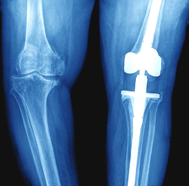 2.ข้อเข่าเทียมสึกหรอ ในกลุ่มคนไข้ที่รับการผ่าตัดเปลี่ยนข้อเทียมตั้งแต่อายุยังน้อย หรือใส่ข้อเทียมมานาน เมื่อเวลาผ่านไปอาจเกิดการสึกหรอของตัวพลาสติกหมอนรองข้อเทียม หรือข้อเทียมที่ยึดกับกระดูกเกิดการหลวมและหลุดออกมา ร่างกายจะขจัดด้วยการสร้างเซลล์ที่เรียกว่า Giant Cell เพื่อเอาสิ่งที่แปลกปลอมออกไปจากบริเวณนั้น โดยเซลล์ดังกล่าวมีคุณสมบัติคือ ทำลายกระดูก ทำลายการยึดของข้อเทียม ทำให้ข้อเทียมตอนแรกที่หนาแน่นแข็งแรง กลับหลวม ข้อเทียมที่แกว่งไปมาจะคว้านกระดูกจนเกิดเป็นรู (Bone Defect) ซึ่งทำให้มีอาการปวดหรือบวมขึ้นได้