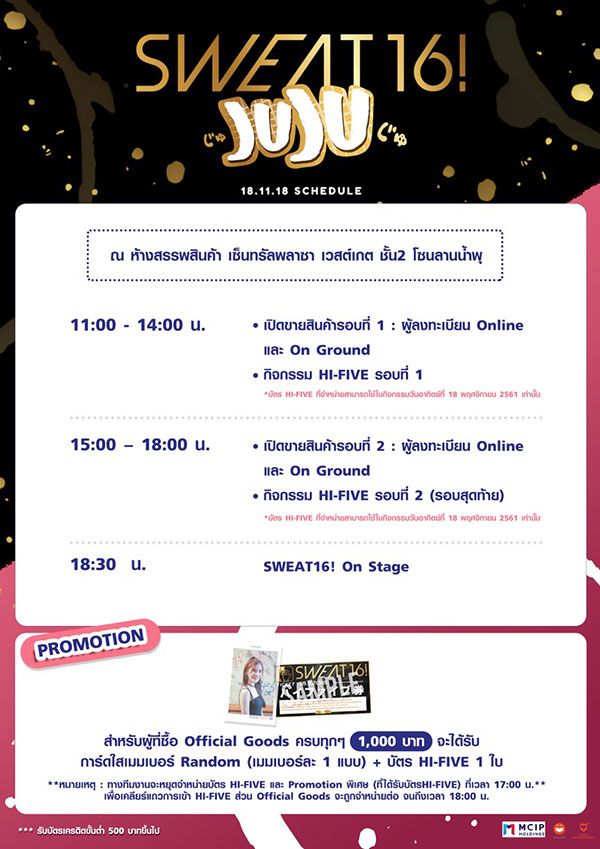 สนุกต่อ…ไม่รอแล้วนะ อาทิตย์ที่ 18 พ.ย. นี้ พลาดไม่ได้กับงาน “SWEAT16! JU JU” พบกับ 13 สาวเกิร์ลไอดอลกรุ๊ป วง SWEAT16! (สเวทซิกซ์ทีน) นำทีมโดย แอ๊นท์-วรินดา เนินเพิ่มพิสุทธิ์ กัปตันวง, ม่านมุก-ชดาธาร ด่านกุล เซ็นเตอร์, มิวสิค-จิดาภา จงสืบพันธ์, แอนนี่-อรรฆพร สร้อยสุข, ซอนญา- ซอนญาชิษณุชา ดอนเนลลี่, นิ้ง-พิชชาภา กันตพิชญาธร, เอ๋-วาสนา พิมพ์จันทร์, พิม-พิม ขจรเวคิน, พาด้า-ปภาดา ตันติประสงค์ชัย, เพชร-พรรษา บุณยะกลัมพ, เฟรม-สุธาสินี เอมทอง, มิ้น-ทสมา เทศน์ธรรม และ พราวด์-ปัทมาริษา ปัดภัย ที่ชั้น 2 โซนลานน้ำพุ เซ็นทรัลพลาซา เวสต์เกต
