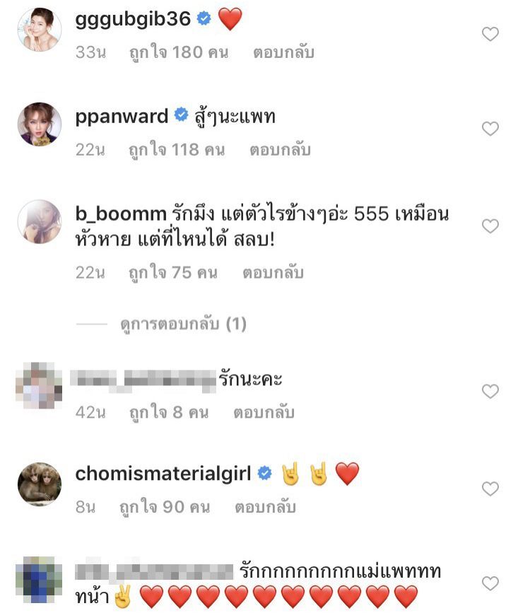 จนวันนี้ทางด้านสาวแพทได้เปิดใจผ่านรายการแชร์ข่าวสาวสตรองว่า ตนเองรู้ที่ฝั่งสามีให้สัมภาษณ์แล้ว ขอบคุณทุกกำลังใจก็จะเดินหน้าของตัวเองไป จะเป็นแม่ของน้องเรซซิ่งเท่านั้น เป็นพิธีกรทำงาน ยากหน่อยแต่ถือว่าชัดเจน พร้อมกับเจ้าตัวได้โพสต์รูปภาพกับน้องเรซซิ่งและแคปชั่นว่า “กำลังใจสำคัญเสมอ #แม่แพทขอบคุณทุกคนมากๆนะคะ #แพทขอโทษที่ทำให้ใครบางคนต้องผิดหวังแต่แพททำเต็มที่ในแบบของแพทแล้ว #ขอโทษที่ทำให้คนๆนึงรู้สึกแย่และไม่มีความสุข #รักเสมอ” ซึ่งก็มีเหล่าคนบันเทิงคนเข้ามาส่งกำลังใจรัวๆ เช่น กุ๊บกิ๊บ สุมณทิพย์ เป้ย ปานวาด บูม สุภาพร ชมพู่ อารยา ดีเจบุ๊คโกะ ธนัชพันธ์ รวมถึงเอฟซีอีกหลายๆ คน ยังไงก็เป็นกำลังใจให้ทุกฝ่ายนะจ๊ะ