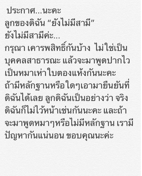 “ประกาศ…นะคะ ลูกของดิฉัน ยังไม่มีสามี ยังไม่มีสามีค่ะ กรุณาเคารพสิทธิ์กันบ้าง ไม่ใช่เป็นบุคคลสาธารณะแล้วจะมาพูดปากไวเป็นหมาเห่าใบตองแห้งกันนะคะ ถ้ามีหลักฐานหรือใดๆ เอามายืนยันที่ดิฉันได้เลย ลูกดิฉันเป็นอย่างว่าจริง ดิฉันก็ไม่ไว้หน้าเช่นกันนะคะ และถ้าจะมาพูดหมาๆ หรือไม่มีหลักฐาน เรามีปัญหากันแน่นอน ขอบคุณนะคะ” ซึ่งหลังจากคุณแม่โพสต์ข้อความดังกล่าวก็มีแฟนๆ มาแสดงความคิดเห็น และให้กำลังใจอย่างล้นหลามเลยทีเดียว
