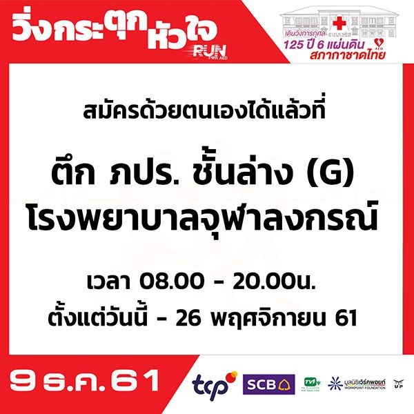 สภากาชาดไทยจัดกิจกรรม“วิ่งกระตุกหัวใจ 125 ปี สภากาชาดไทย” ซึ่งเป็นกิจกรรมแรกภายใต้“โครงการกระตุกหัวใจ เพื่อคนไทยทุกคน”เพื่อหารายได้จัดซื้อเครื่องกระตุกหัวใจไฟฟ้า (AED)และพร้อมส่งต่ออุปกรณ์ช่วยชีวิตประชาชนในกรณีฉุกเฉิน ไปยังส่วนภูมิภาคทั่วประเทศในวันอาทิตย์ที่ 9 ธันวาคม 2561 เวลา 05.00 น. เป็นต้นไป บริเวณลานหน้าอาคารภูมิสิริมังคลานุสรณ์ โรงพยาบาลจุฬาลงกรณ์ สภากาชาดไทยและสำหรับผู้ที่สนใจสมัครเข้าร่วมกิจกรรม