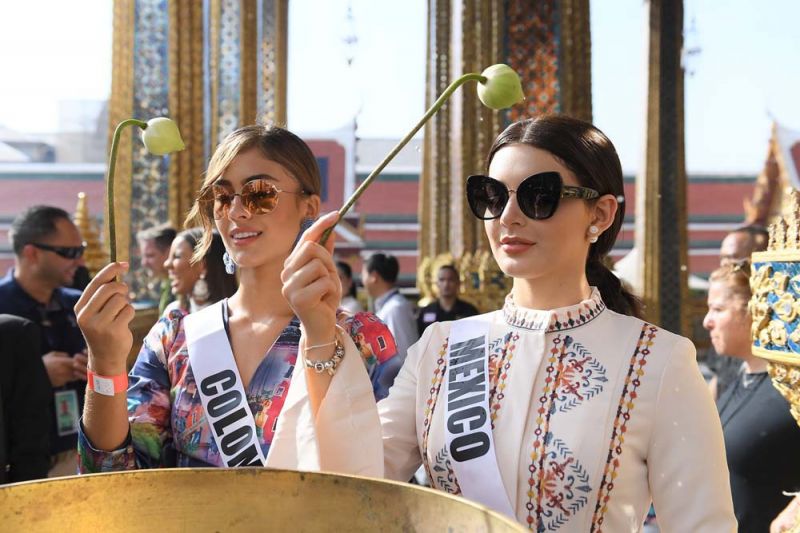 โอกาสนี้ บรรดาสาวงามได้ร่วมสักการะพระพุทธมหามณีรัตนปฏิมากร หรือ พระแก้วมรกต ในพระอุโบสถ เพื่อขอพรสิ่งศักดิ์สิทธิ์และถือเป็นการเอาฤกษ์เอาชัย สำหรับการทำกิจกรรมต่างๆ รวมถึงชื่นชมงานจิตรกรรมฝาผนังรอบระเบียงคต ความสวยงามของพระอุโบสถ เจดีย์ทอง และปราสาทพระเทพบิดร ที่อยู่ภายในวัดพระศรีรัตนศาสดาราม และพระที่นั่งจักรีมหาปราสาทอย่างสนใจ ท่ามกลางเหล่าแฟนคลับนางงามทั้งชาวไทยและชาวต่างชาติจำนวนมากที่เมื่อทราบข่าว ต่างมารอต้อนรับและให้กำลังใจกันอย่างอบอุ่น