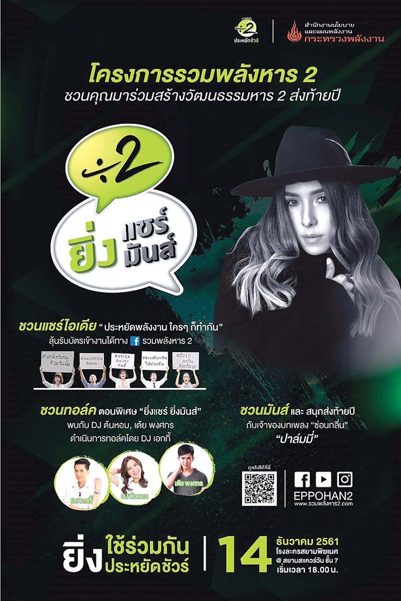 โครงการรวมพลังหาร 2 โดยสำนักงานนโยบายและแผนพลังงาน (สนพ.) กระทรวงพลังงาน ต่อยอดความสำเร็จกระแสคลิปวัฒนธรรมหาร 2เตรียมจัดกิจกรรม “หาร 2 ยิ่งแชร์ ยิ่งมันส์” ดึงศิลปินดังขวัญใจวัยแชร์คับคั่งร่วมสร้างสีสันแคมเปญพร้อมรณรงค์คนไทย “ชวนกันแชร์แบ่งกันใช้” ต่อเนื่อง