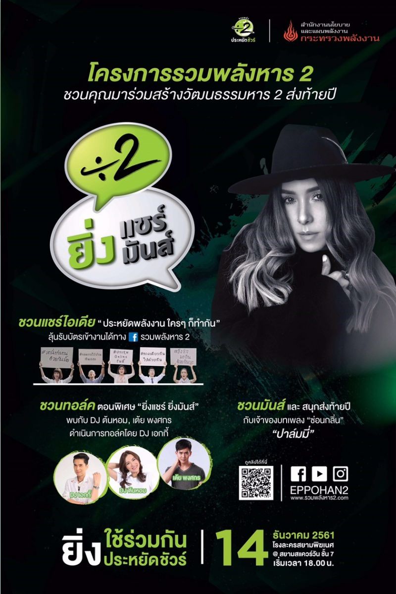 โครงการรวมพลังหาร 2 โดยสำนักงานนโยบายและแผนพลังงาน (สนพ.) กระทรวงพลังงาน ต่อยอดความสำเร็จกระแสคลิปวัฒนธรรมหาร 2 เตรียมจัดกิจกรรม“หาร 2ยิ่งแชร์ ยิ่งมันส์” ดึงศิลปินดังขวัญใจวัยแชร์คับคั่งร่วมสร้างสีสันแคมเปญพร้อมรณรงค์คนไทย‘ชวนกันแชร์ แบ่งกันใช้’ต่อเนื่อง