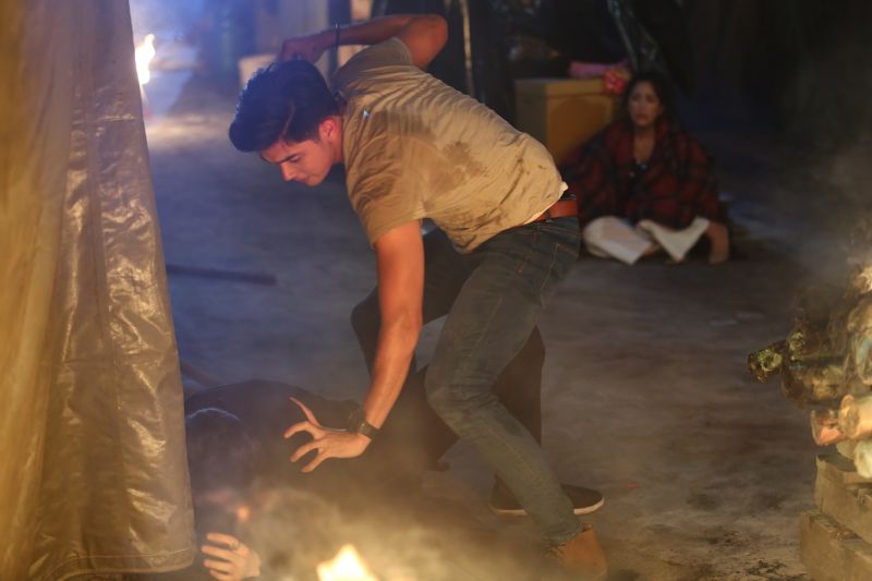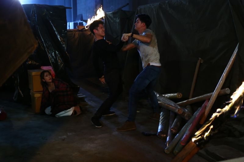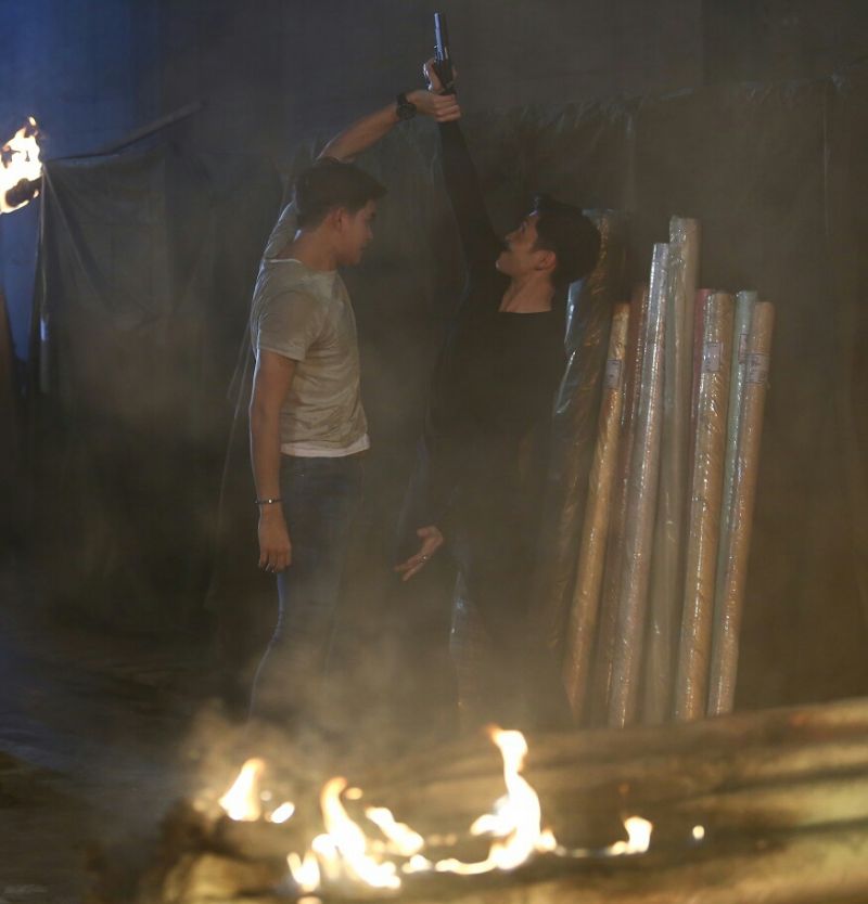 เบื้องหลังการถ่ายทำฉากนี้ บอกเลยว่าไม่ใช่งานง่าย เพราะ เพชร-พุฒิพงศ์ ผู้กำกับ อยากได้ภาพที่สมจริงที่สุด ดังนั้นไฟต้องเป็นไฟ ไม่ใช้ซีจี แต่อย่างไรก็มีการเตรียมความปลอดภัยเพื่อนักแสดงเต็มที่ งานนี้เหล่านักแสดงเลยมั่นใจ พร้อมโชว์สปิริต ออกตัวตั้งแต่เริ่มเลยว่า ต้องการเล่นเอง ฉากนี้จึงไม่มีสแตนด์อินเข้ามาช่วย แม้ความร้อนของเปลวไฟซึ่งทำให้เกิดควันสร้างความลำบากในการถ่าย แต่ความเป็นมืออาชีพของทั้ง 3 ก็สามารถถ่ายทอดอารมณ์ของตัวละครในฉากนี้ออกมาได้อย่างสมจริงที่สุด โดยเฉพาะสองหนุ่มที่ต้องบู๊กันในฉาก ทั้งเข้ม และ แพน ก็นัดแนะการออกหมัด โชว์การต่อสู้ได้ภาพออกมาอย่างสวยงาม