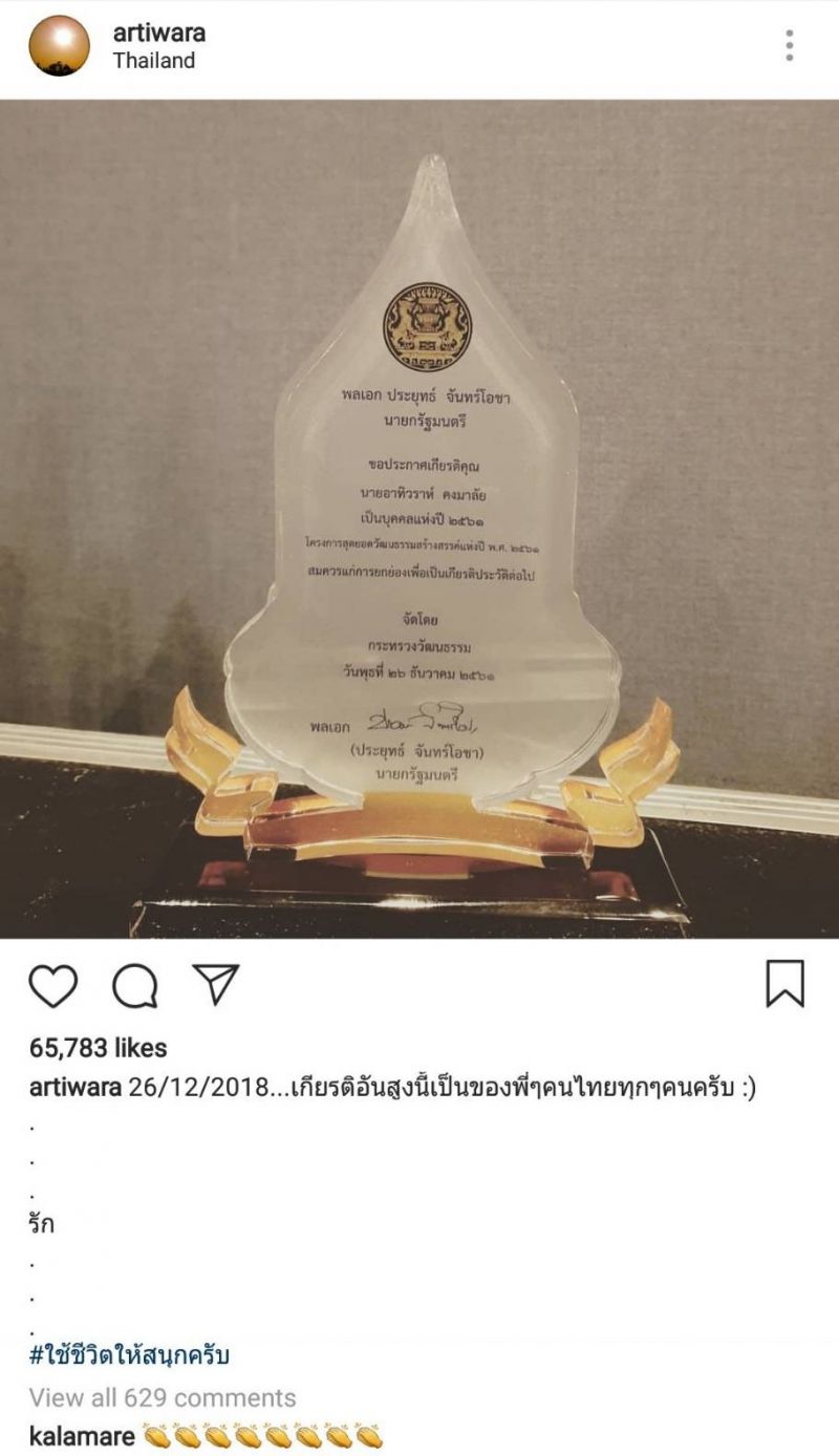 โดยล่าสุด พล.อ.ประยุทธ์ จันทร์โอชา นายกรัฐมนตรี ได้มอบโล่รางวัลประกาศเกียรติคุณ บุคคลแห่งปี 2561 ให้กับ “ตูน บอดี้สแลม” ซึ่งเจ้าตัวได้โพสต์ภาพลงอินสตาแกรมพร้อมข้อความระบุว่า “26/12/2018…เกียรติอันสูงนี้เป็นของพี่ ๆ คนไทยทุก ๆ คนครับ รัก #ใช้ชีวิตให้สนุกครับ”
