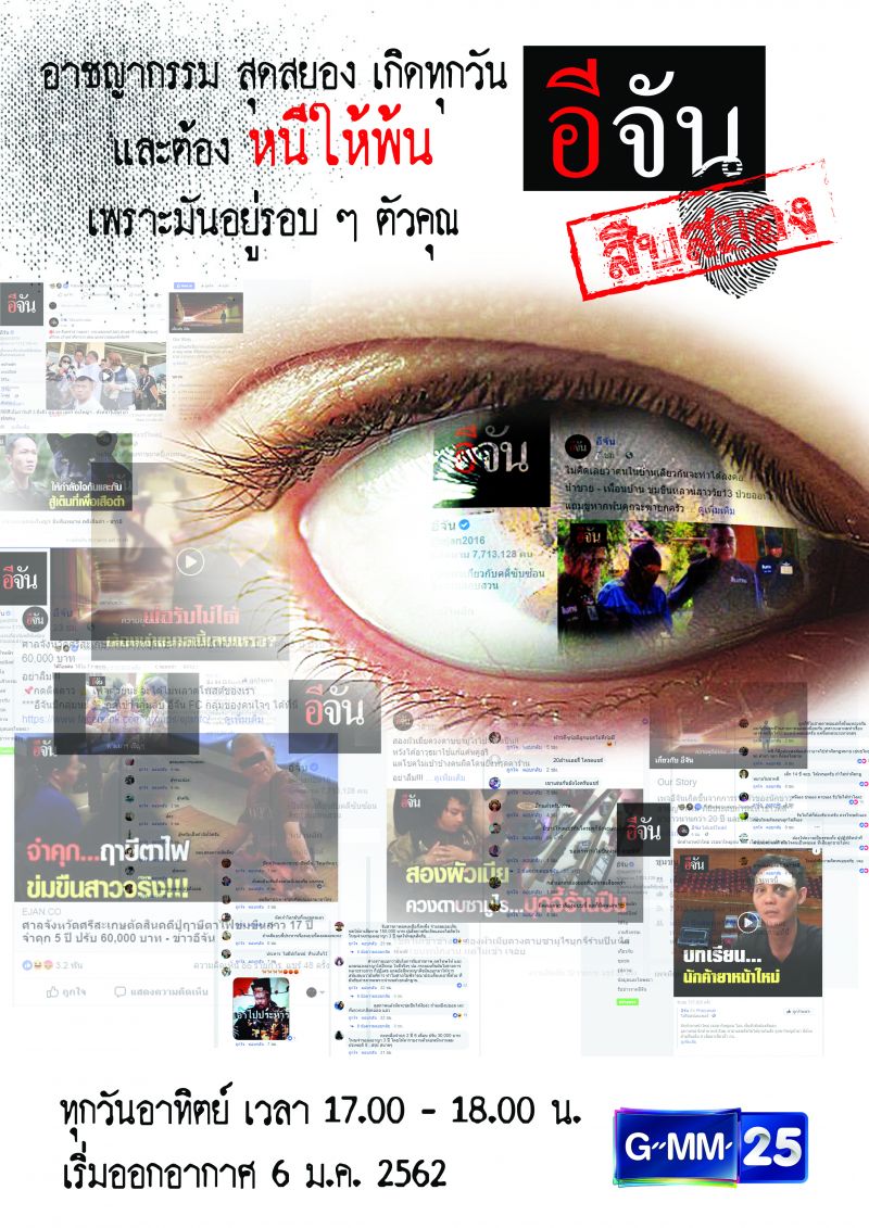 ต้อนรับปีหมูกันด้วยความสนุกตื่นเต้น ชวนลุ้นระทึก ไปกับรายการใหม่ที่ช่อง GMM25ส่งตรงให้แฟนๆ ได้ดูกันแบบครบรสจากแฟนเพจชื่อดังสู่รายการทีวี “อีจัน สืบสยอง” รายการที่จะมาไขคดีปริศนาที่ซับซ้อนพร้อมตีแผ่ความจริงให้สังคมได้รับรู้ด้วยการเล่าเรื่องในสไตล์ของ “อีจัน”ไม่อ้อมค้อม เข้าใจง่าย ดำเนินรายการโดย ลูกตาล – ทิพย์รัตน์ อมาตยกุล และ แจนโล่ – ธนภัทร ศุภวรรณาวิวัฒน์ที่จะนำคดีแรงคดีร้าย คดีดังมาแยกชิ้น ตีแผ่แตกประเด็น ไม่ว่าจะคดีดังที่ถูกลืมคดีแปลกเหลือเชื่อ คดีโหดเหี้ยม อันตราย“อีจัน สืบสยอง” จะเตือนภัยให้คุณรอด ร่วมคลี่คลายคดีอาชญากรรมปริศนาทั้งอดีตและปัจจุบันกันได้ทุกวันอาทิตย์ เวลา 17.00-18.00 น. ทางช่อง GMM25